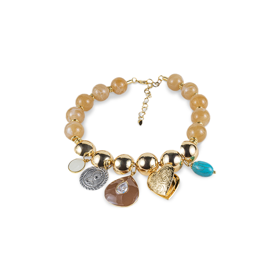 Descrição: Colar de Esferas em resina e lisas, com pingentes diversos