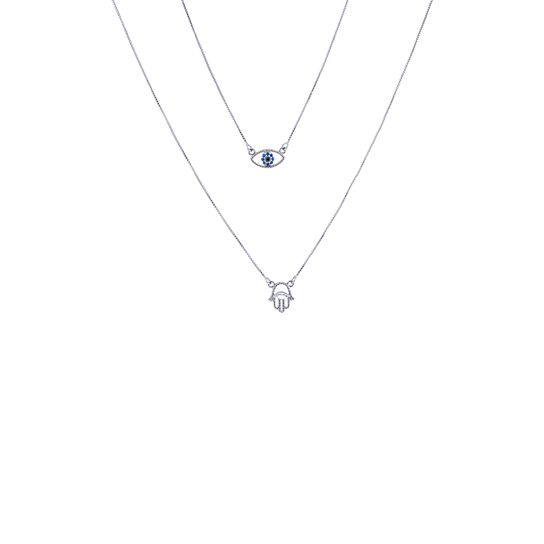 COLAR ESCAPULARIO EM OLHO GREGO DE UMA LADO, E NO OUTRO EM HAMSA COM CRAVAÇÃO DE ZIRCONIA AZUL E A HAMSA EM CRAVAÇÃO DE ZIRCONIA CRISTAL. BANHO DE RODIO BRANCO. CORRENTE VENEZIANA. PRA USAR DE UM LADO SÓ, POIS A PEÇA NÃO TEM FECHO.